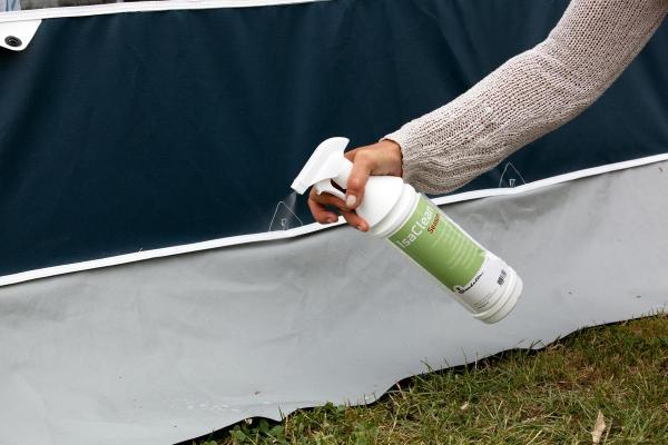 Produktet er nemt at bruge: Start med at børste overfladen uden vand, gennemvæd teltdugen, spray IsaClean Season direkte på stoffet, børst med en våd børste og skyl grundigt med vand, til al sæberest er væk.