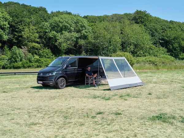 Ein einfaches Sonnendach, das sich leicht mitnehmen lässt und am Fahrzeug schnell für Schatten und einen trockenen Eingang sorgt. Das Shade wird direkt an der Kederleiste montiert und ist mit einer integrierten Front ausgestattet. Je nachdem wie die Höhe der Aufstellstangen gewählt wird, lässt sich die Front mehr oder weniger schräg abspannen. Somit variiert auch die Tiefe am Boden.
