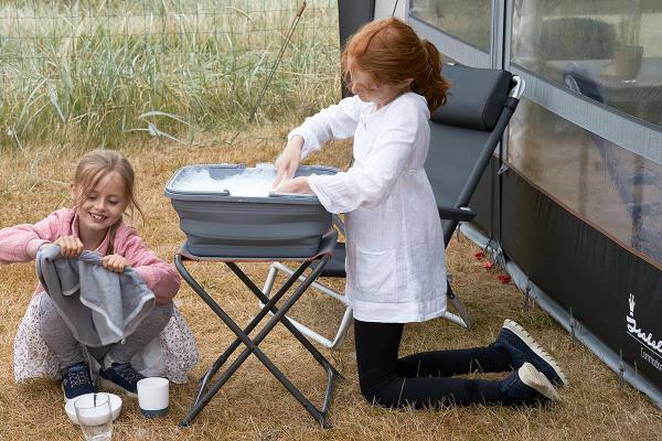 Die Abwaschschüssel besteht aus Silikon mit Oberteil und Boden aus Hartplastik.