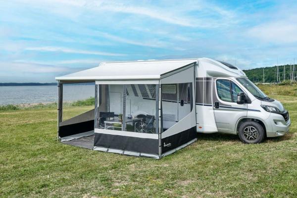 Schaffen Sie einen gemütlichen Außenbereich vor Ihrem Wohnwagen, Wohnmobil oder Van mit Wind Front, das einfach an Ihrem ausrollbaren Vorzelt befestigt werden kann und zusätzlichen Schutz und Komfort bietet. Wind Front ist in einer Breite von 120 oder 220 cm erhältlich und passt für Wohnwagen/Fahrzeuge mit einer montagehöhe von 245-270 cm.