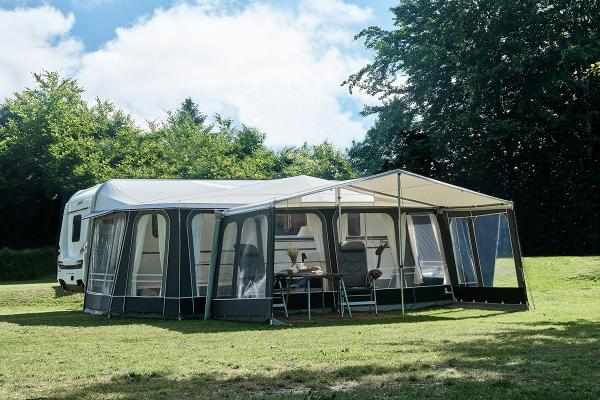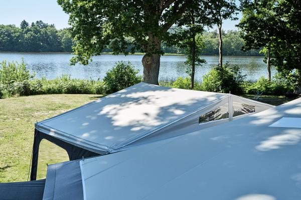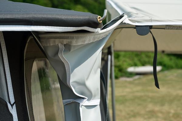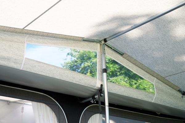 Das Penta-Frontsonnendach verfügt über eine spezielle PVC-Regenrinne, um eine Verbindung des Sonnendachs mit dem Vorzelt zu ermöglichen und das Eindringen von Regenwasser zu vermeiden. Mit den speziell konstruierten Fallrohren wird das Wasser vom Vorzeltdach auf beiden Seiten abgeleitet.