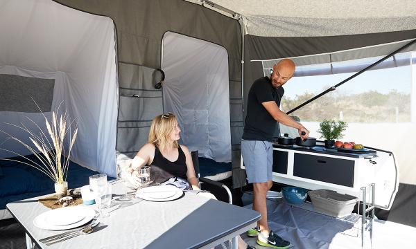 Unter der Arbeitsplatte befinden sich zwei geräumige Ablagefächer und ein Regal, in denen Sie Ihr Geschirr und Ihre Kochutensilien gut organisiert und leicht zugänglich aufbewahren können. Die Küche verfügt außerdem über einen faltbaren 10-Liter-Wasserkanister und eine faltbare Spülschüssel, die beide beim Transport nur wenig Platz benötigen. Der serienmäßige Wasserhahn ist mit einem Akku ausgestattet der 40 min. im Dauerbetrieb gewährleistet. Die integrierte Tauchpumpe fördert dabei 3,5 L pro Minute.