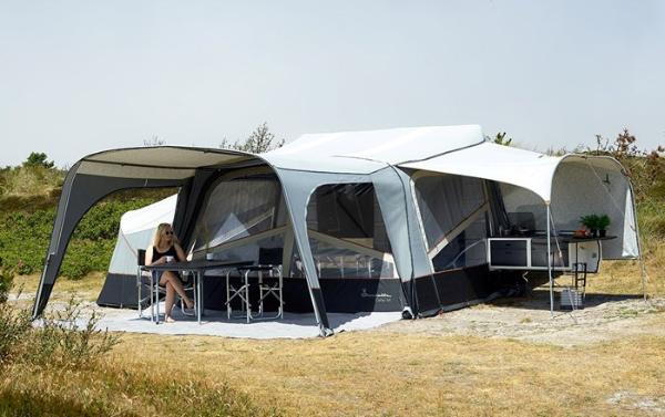 Das Passion Sonnendach wird mit einem Reißverschluss am Zeltanhänger befestigt und bietet Schatten und einen zusätzlichen überdachten Aufenthaltsbereich. Für zusätzlichen Windschutz lassen sich die Seitenteile mit Gardinen ganz einfach mittels Reißverschluss befestigen.