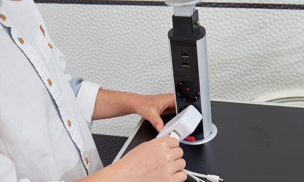 Wenn er nicht gebraucht wird, kann der Tower einfach im Schrank versenkt werden, sodass keine Kabel sichtbar sind. Der Tower lässt sich schnell und ohne Werkzeug in den Isabella-Schränken montieren. Wenn du ihn in deinem eigenen Schrank haben möchtest, kannst du einfach ein Loch bohren und ihn dort installieren.