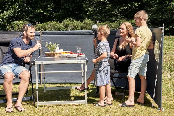 Stilvoller 4-seitiger Windschutz mit braun einfassten Ecken (Lederoptik) und Isabella-Bullauge. Das Design des Windschutzes North ist abgestimmt auf die Vorzelte und Faltcaravans unserer beliebten North-Serie.
