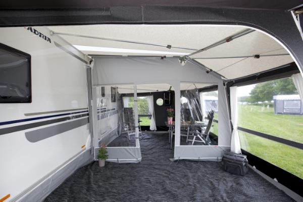 Når du ønsker at bruge forteltet i fuld bredde, kan hele inderpanelet aflynes. Der er mulighed for gardinmontering direkte på rumdeler ved brug af gardinclips (ekstraudstyr).