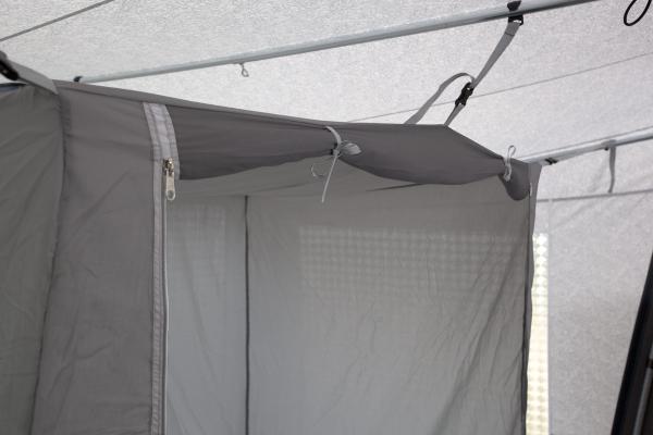 El compartimento para dormir ideal para niños o invitados. Fabricado de material de color gris oscuro para bloquear la luz. Para crear las mejores condiciones dentro del compartimento para dormir, el anexo está equipado con una mosquitera y suelo de PVC. Ventilación ideal y humedad ascendente mínima.