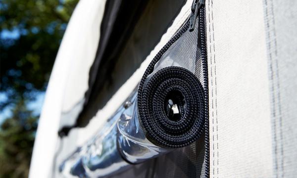 Hyttysverkkoikkuna molemmissa päädyissä ja hyttysverkollinen säädettävä tuuletusaukko etuseinässä.