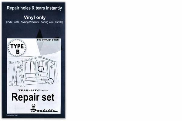 Kit de réparation Isabella pour les auvents. Ces tissus sont transparents. Le type B est pour le PVC : il a été conçu spécialement pour la réparation de fenêtres, de toits en PVC et des panneaux inférieurs des auvents. Également disponibles en Type A pour l'acrylique.