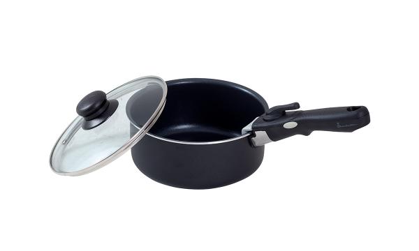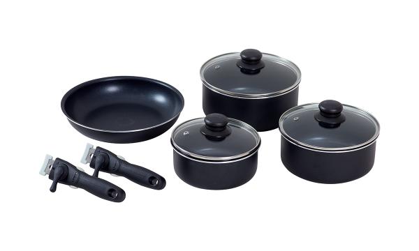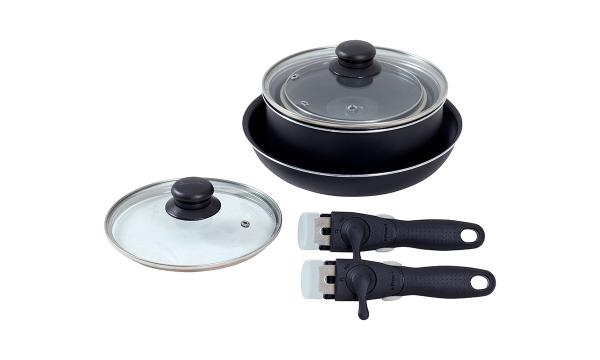 De potten- en pannenset bestaat uit drie potten, drie glazen deksels, één pan en twee afneembare handgrepen. De set is makkelijk stapelbaar en neemt weinig ruimte in als je hem opbergt. De bodems van de potten en pan verdelen de warmte gelijkmatig voor de beste kookresultaten met een laag energieverbruik. De glazen deksels hebben stoomopeningen en hittebestendige kunststof handgrepen voor veilig gebruik. De set kan gebruikt worden op inductie, gaskookpitten en keramische kookplaten.
