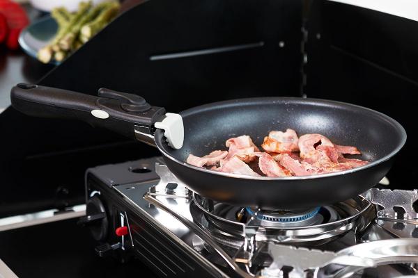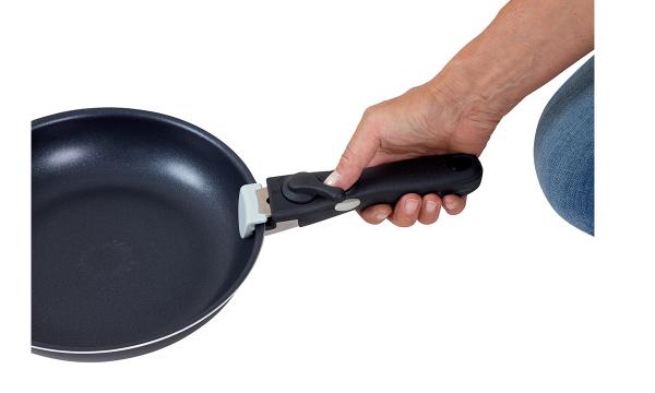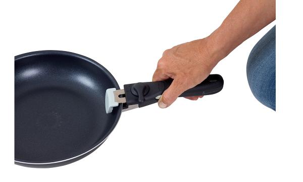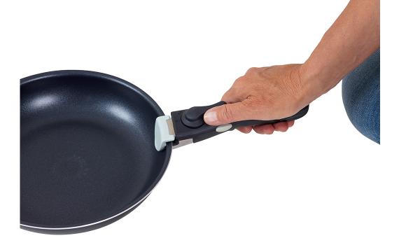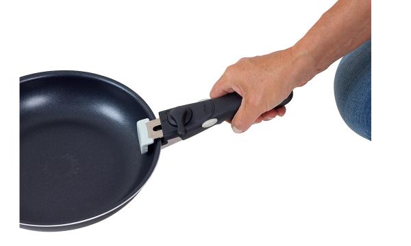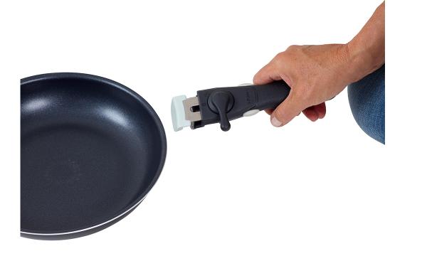 De handgrepen zijn eenvoudig te monteren door het slot naar de zijkant te draaien. Ze zijn voorzien van een dubbel veiligheidsslot om te voorkomen dat ze per ongeluk worden geopend. Ze passen op beide pannen en kunnen gemakkelijk verwisseld worden.