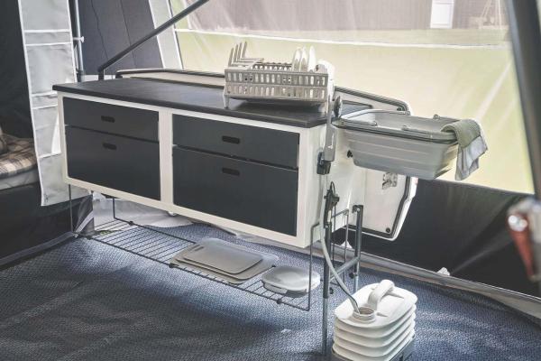 Potrzebujesz przestronnej i funkcjonalnej kuchni do swojego Camp-let? Kuchnia Basic+ została zaprojektowana z myślą o łatwym przygotowywaniu pysznych posiłków, nawet gdy jesteś w ruchu. Dzięki dużemu i solidnemu blatowi roboczemu będziesz mieć mnóstwo miejsca do siekania, mielenia i przygotowywania posiłków. Praktyczny zlewozmywak można łatwo złożyć, gdy nie jest używany, co ułatwia optymalizację przestrzeni.